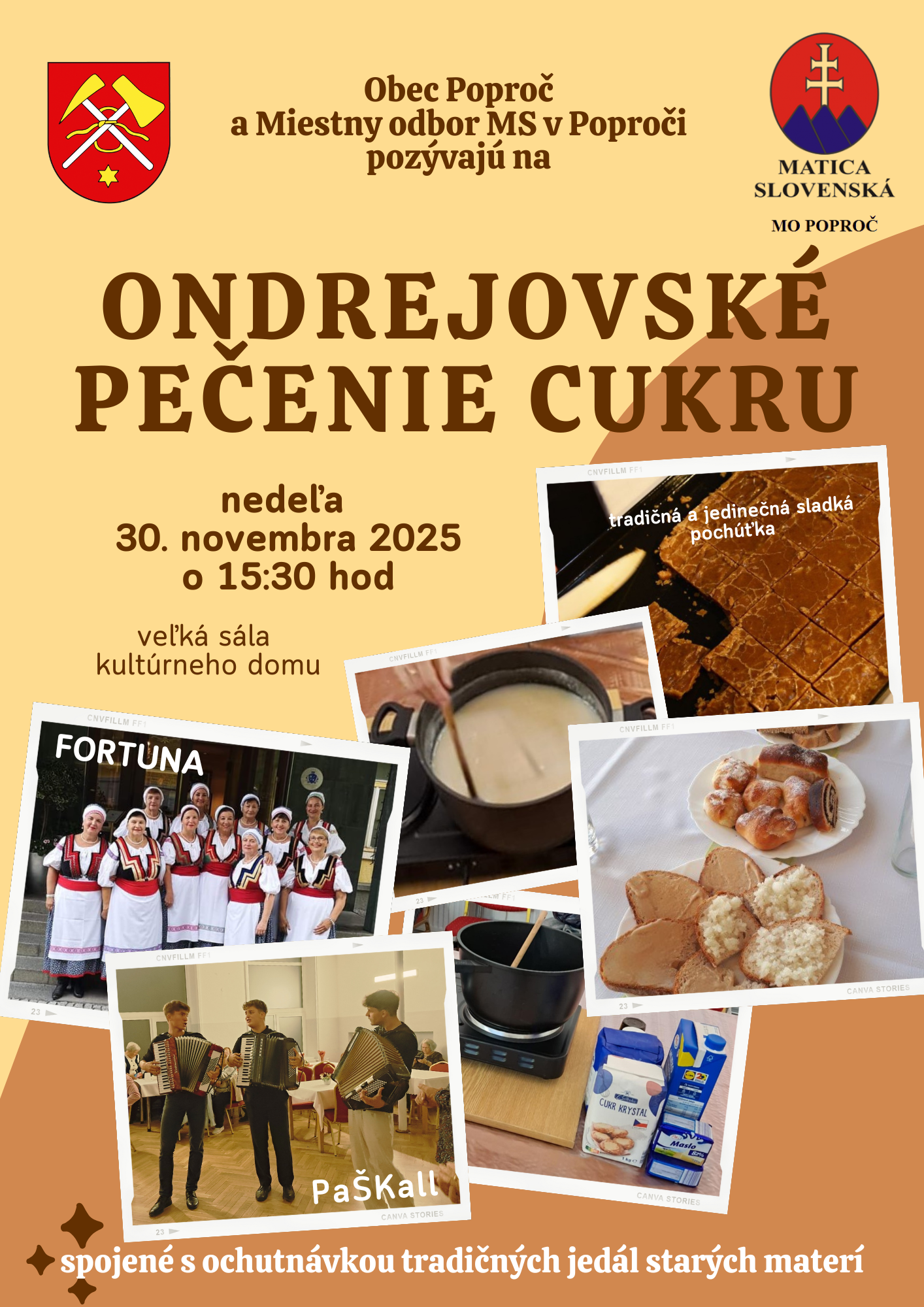 Obec Poproč v spolupráci s Miestnym odborom Matice slovenskej Vás pozýva na Ondrejovské pečenie cukru v nedeľu 30. novembra 2025 so začiatkom o 15:30 hod.